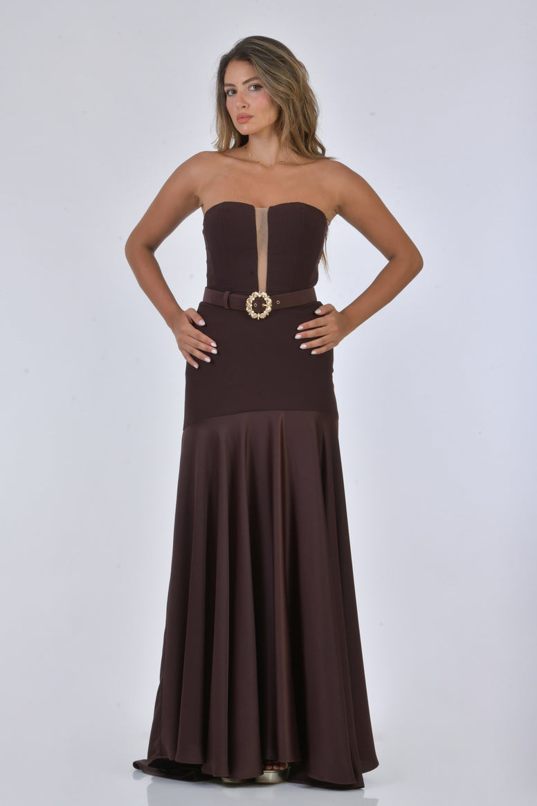 Timeless Elegance Satin and Crepe Strapless GownCrafted from luxurious satin and crepe, this strapless gown features a structured bodice and a flowing floor-length skirt, exuding effortless glamour and timeless sophistication for any special occasion.
