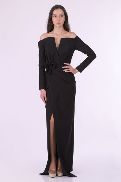 Off-shoulder stretch crepe dress with handcrafted flower detail at the waist. Elegant and flattering for formal occasions.