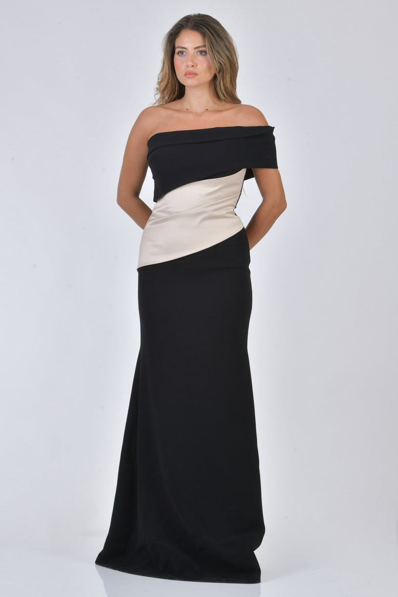 This elegant maxi gown features a single-shoulder design crafted from a luxurious combination of satin and crepe. Flowing gracefully to the floor, it offers a flattering silhouette with timeless sophistication, perfect for formal events and evening occasions.