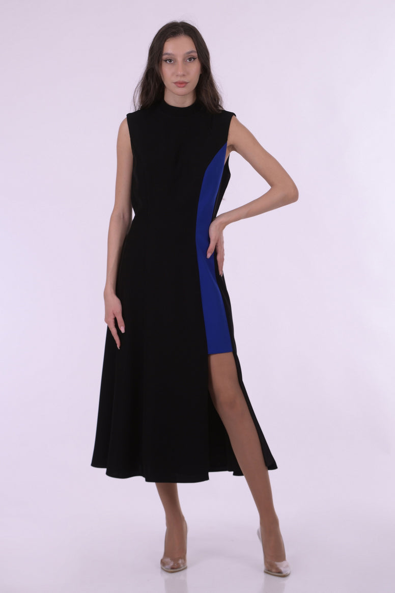 Sleeveless crepe dress in black and blue with an asymmetric hem and semi-cloche silhouette. Perfect for chic evening occasions.