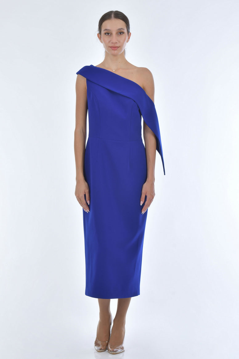 This elegant midi dress is crafted from smooth crepe and features a contemporary cold-shoulder design. With its flattering silhouette and refined detailing, it’s perfect for both professional settings and stylish evening occasions.
