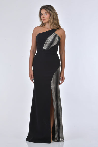 Pleated Metallic Dress Fused with Black Crepe, Detailed with a SlitThis striking dress features a pleated metallic fabric fused with elegant black crepe, creating a bold yet sophisticated look. A sleek slit adds movement and allure, making it perfect for evening events or standout special occasions.