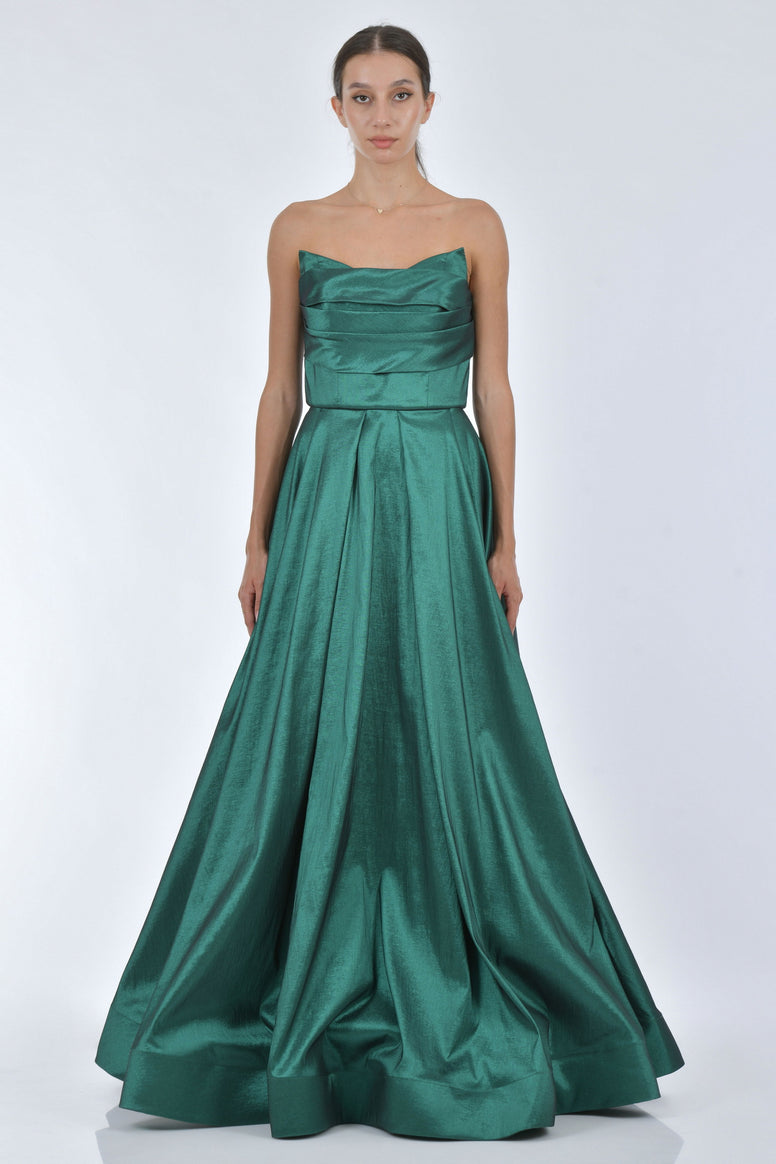 This stunning strapless gown is crafted from lustrous taffeta, featuring a flowing maxi silhouette that exudes elegance and sophistication. Perfect for formal events and special occasions, it combines timeless style with a dramatic, statement-making finish.