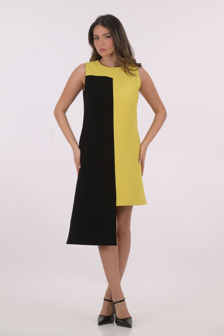 Crepe asymmetric color block dress featuring fluid movement and a sculpted silhouette, balanced by clean lines for a modern, sophisticated statement.