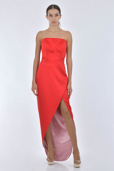 This striking strapless dress is crafted from luxurious satin and features a bold color-block design for a modern, eye-catching look. Its sleek silhouette and elegant construction make it perfect for evening events or special occasions.