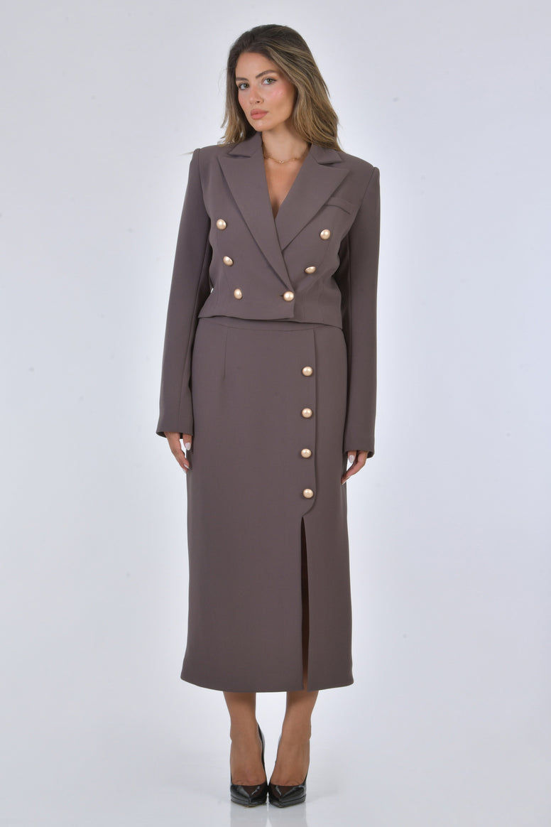 This tailored cropped blazer features a sleek silhouette and refined button detailing for a modern, polished look. Versatile and chic, it’s perfect for layering over dresses, tops, or high-waist bottoms to elevate any outfit.