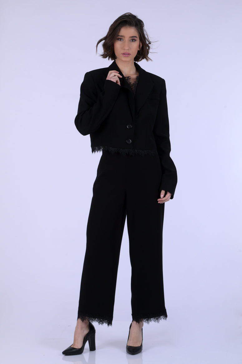 Elegant cropped crepe pants designed with delicate lace details on the hems. A refined piece that adds a feminine and sophisticated touch to any modern look.