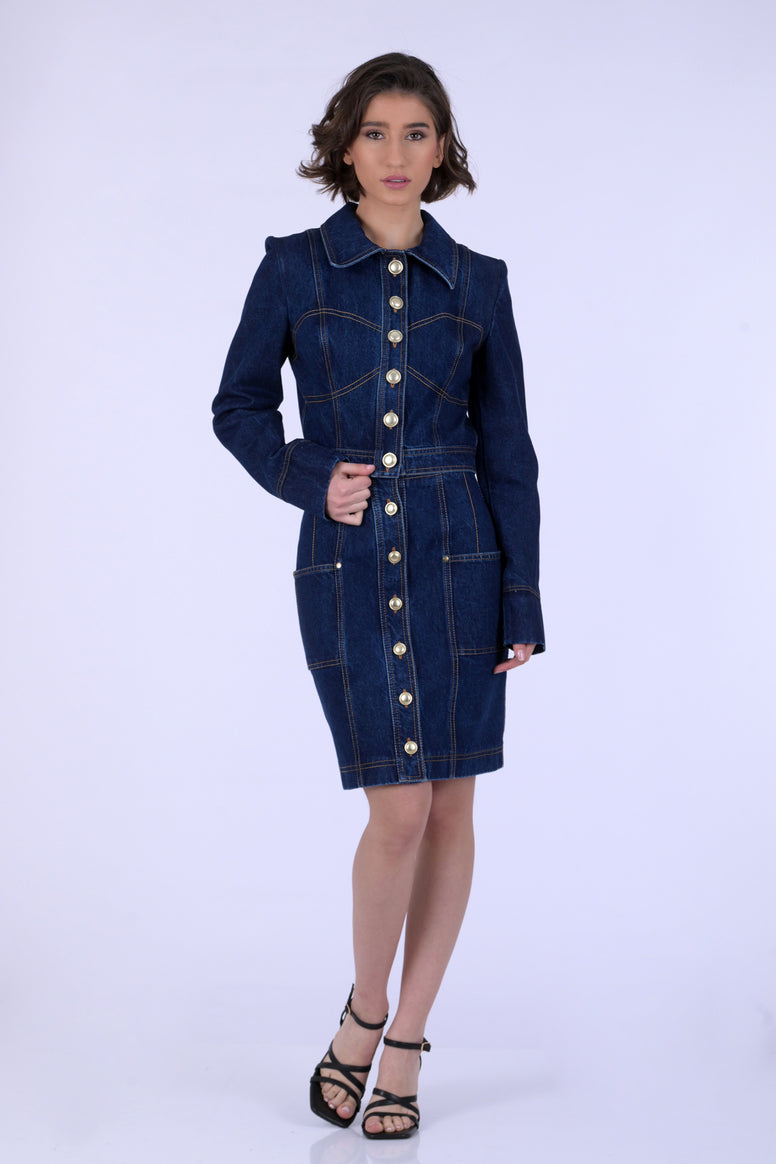 A structured denim mini skirt defined by refined stitching details and accented with gold buttons. Designed to deliver a sharp, modern silhouette with a confident edge.