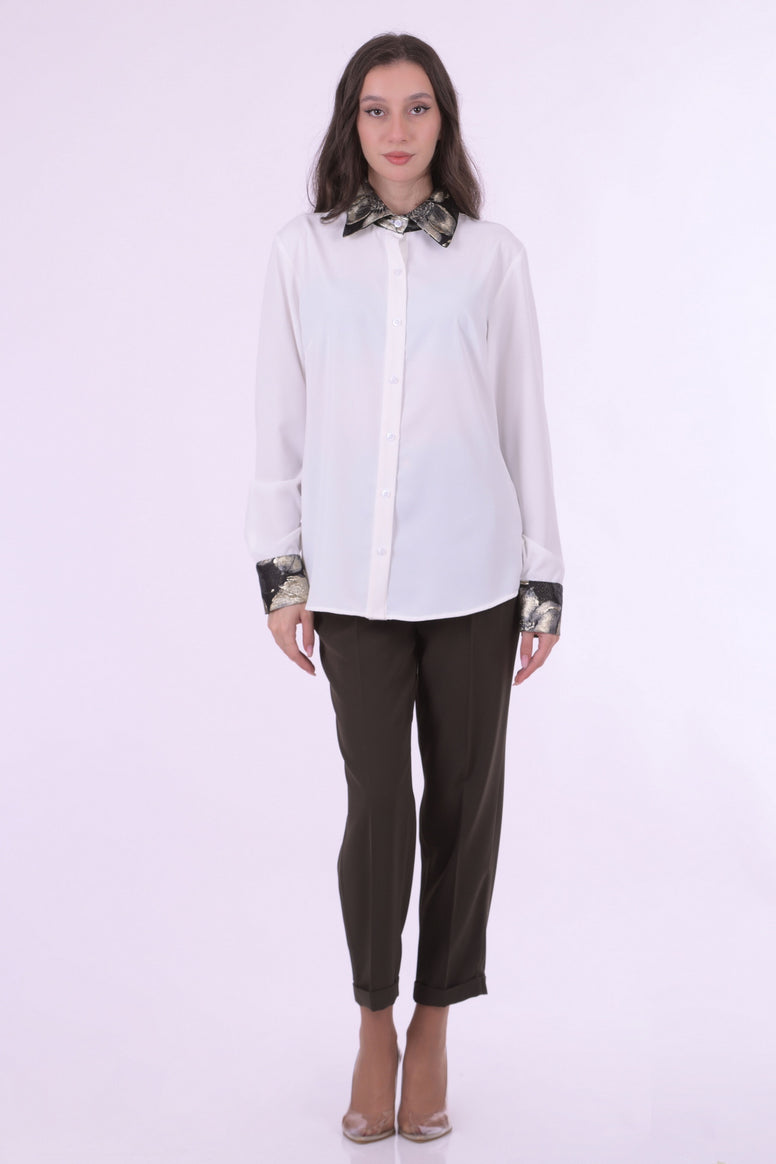White crepe georgette top featuring a brocade collar and cuffs. Elegant and versatile for both daywear and evening styling.