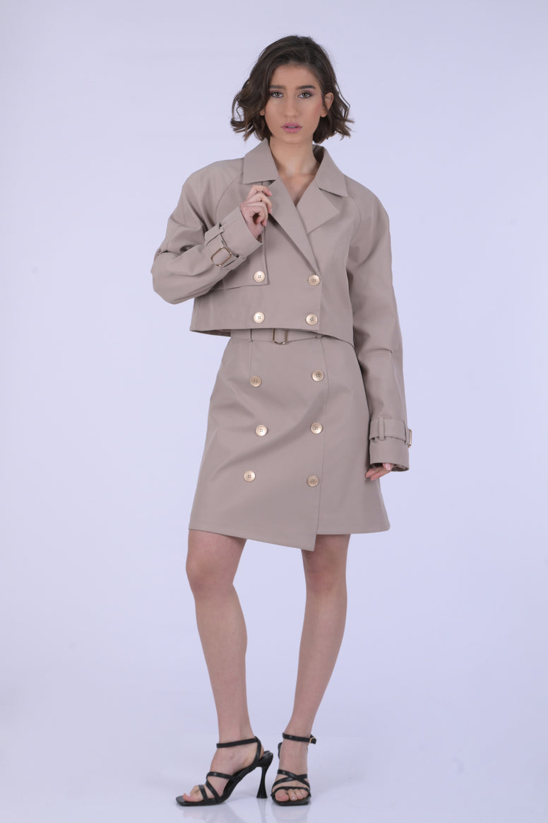 A structured gabardine skirt with an asymmetric cut and flared silhouette, detailed with bold statement buttons. Modern and elegant, it brings movement and a contemporary edge to any look.