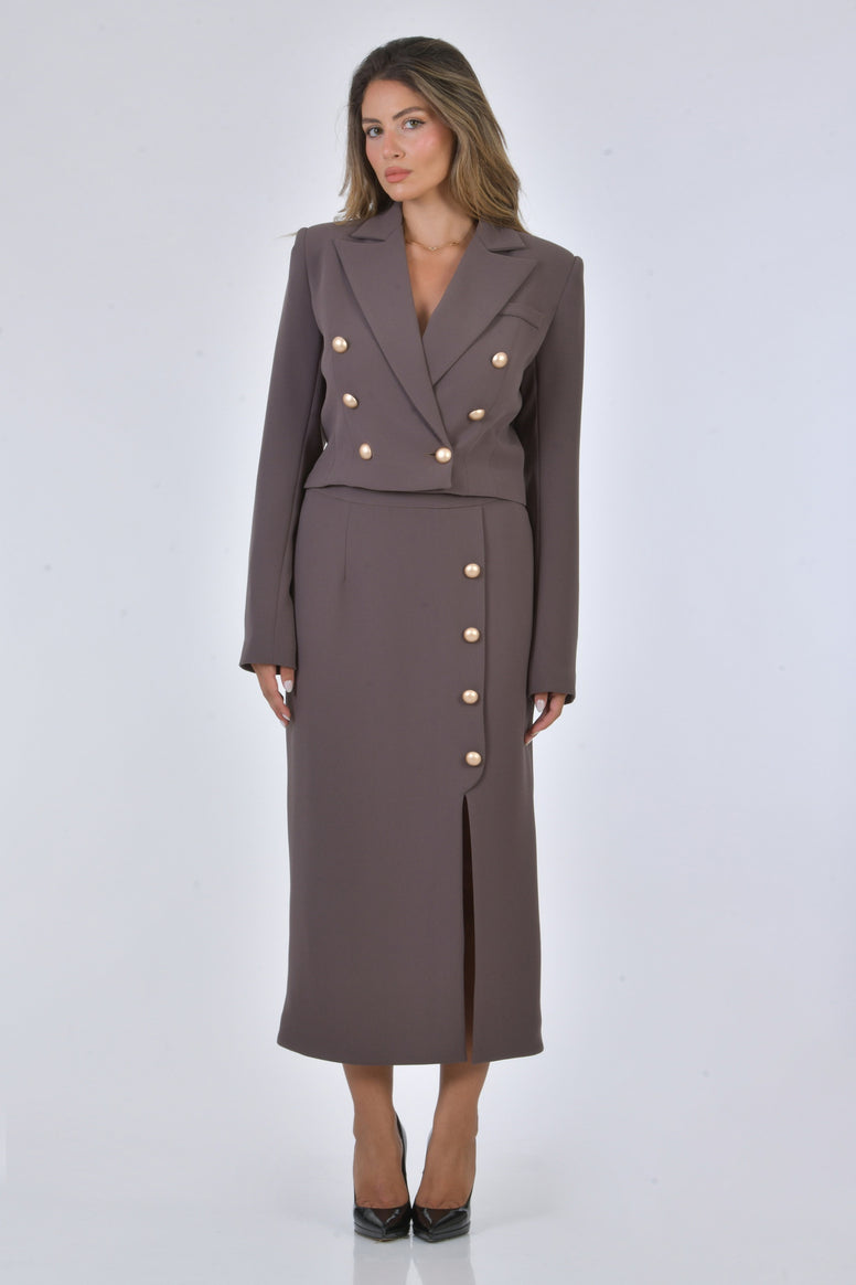 Crafted from smooth crepe, this black midi skirt features elegant button detailing for a modern, tailored finish. Its versatile silhouette makes it perfect for both professional settings and chic evening looks.