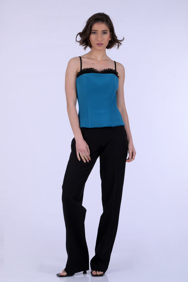 A structured crepe corset adorned with delicate lace accents. Designed to highlight the waist, it blends feminine elegance with modern sophistication.