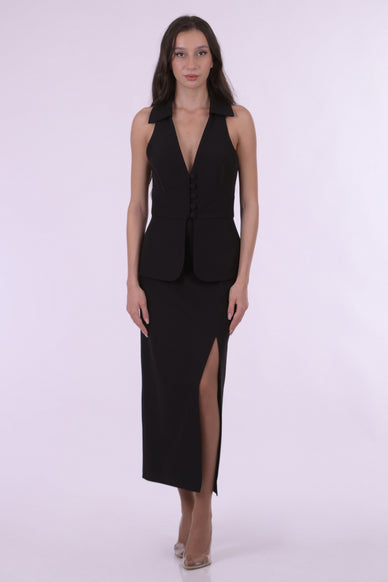 Tailored stretch crepe top with a deep plunging neckline and structured collar. Designed for a sleek and confident look.